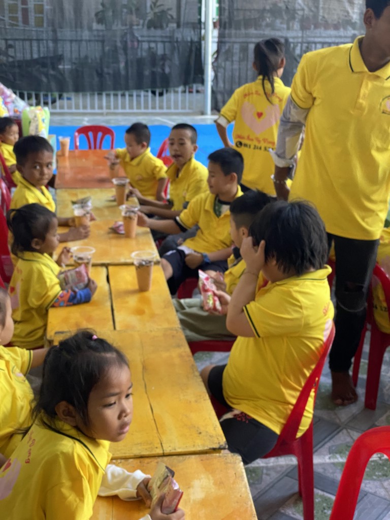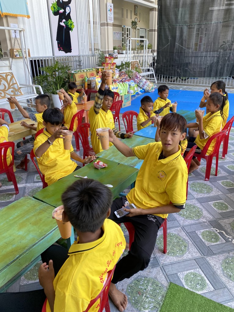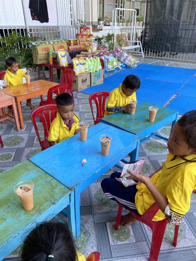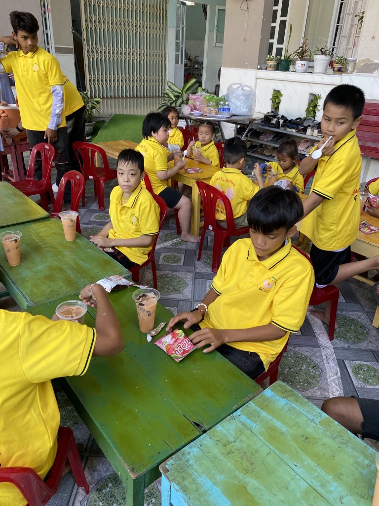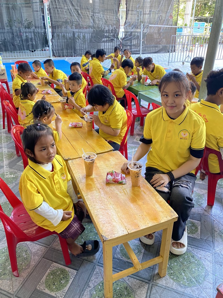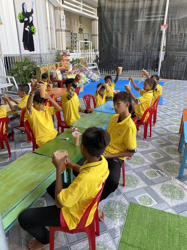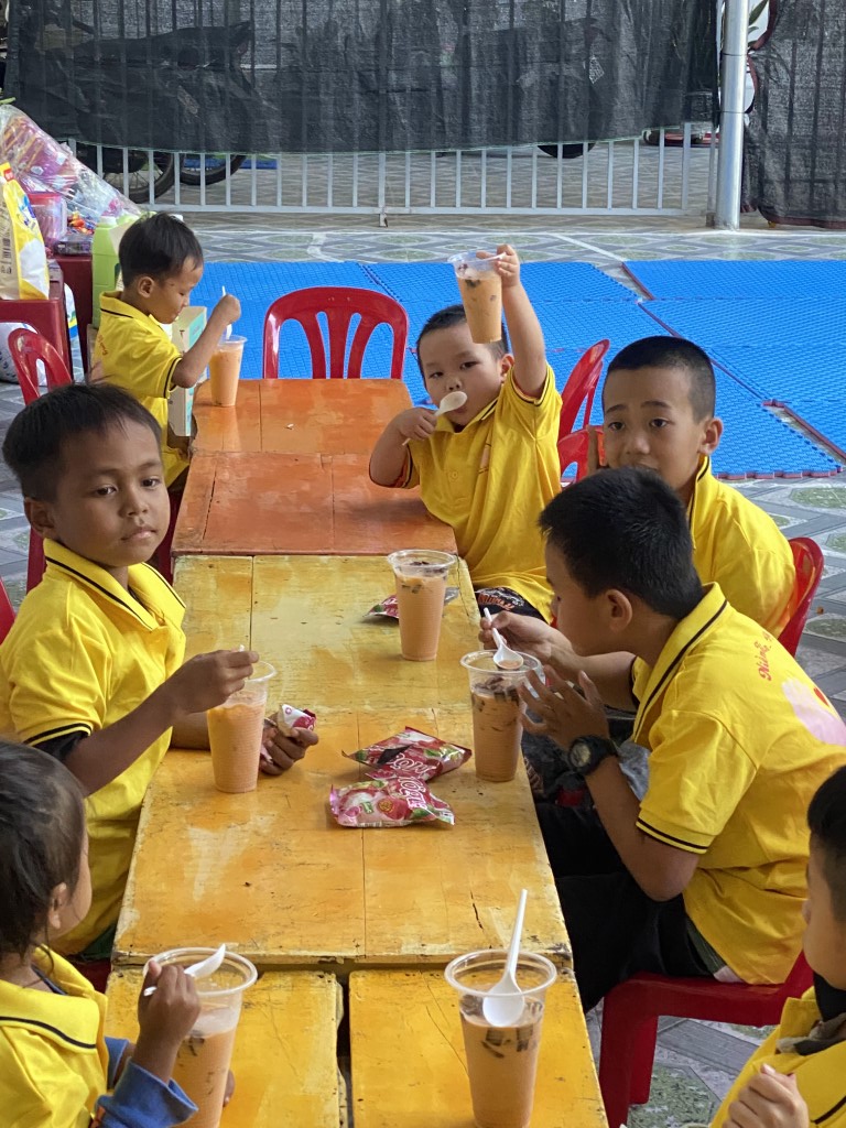 Upon arrival, we were warmly greeted by the children happily playing in the courtyard. Our team unloaded everything, including bags of rice, milk, noodles, fish sauce, sweet rice, eggs, lots of snacks, floor soap, dish soap, and insect spray. To add to the fun, we even prepared boba tea drinks for everyone. It was truly a wonderful day!