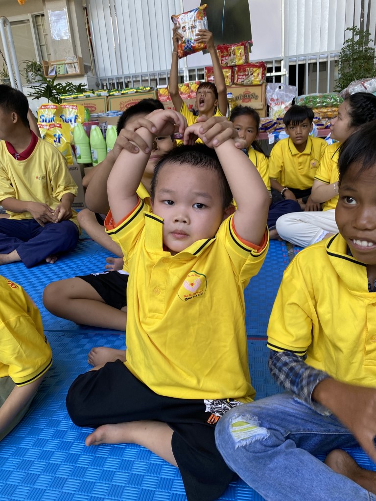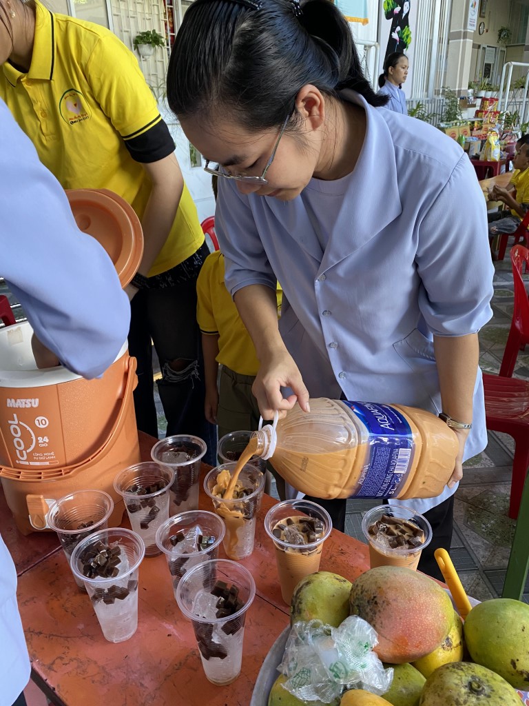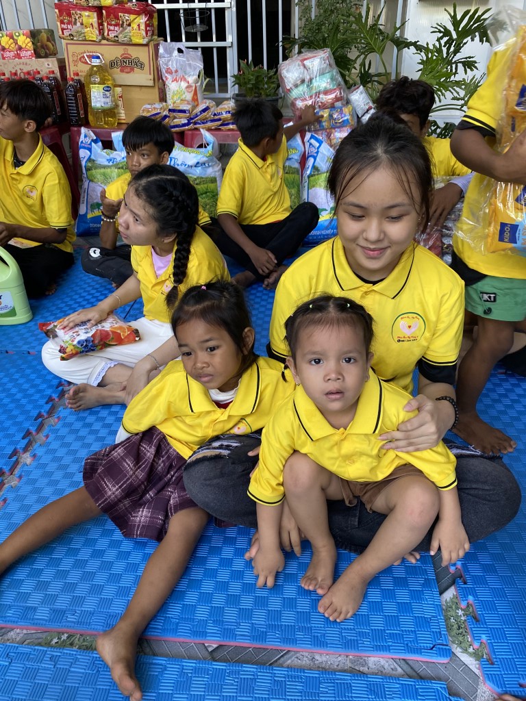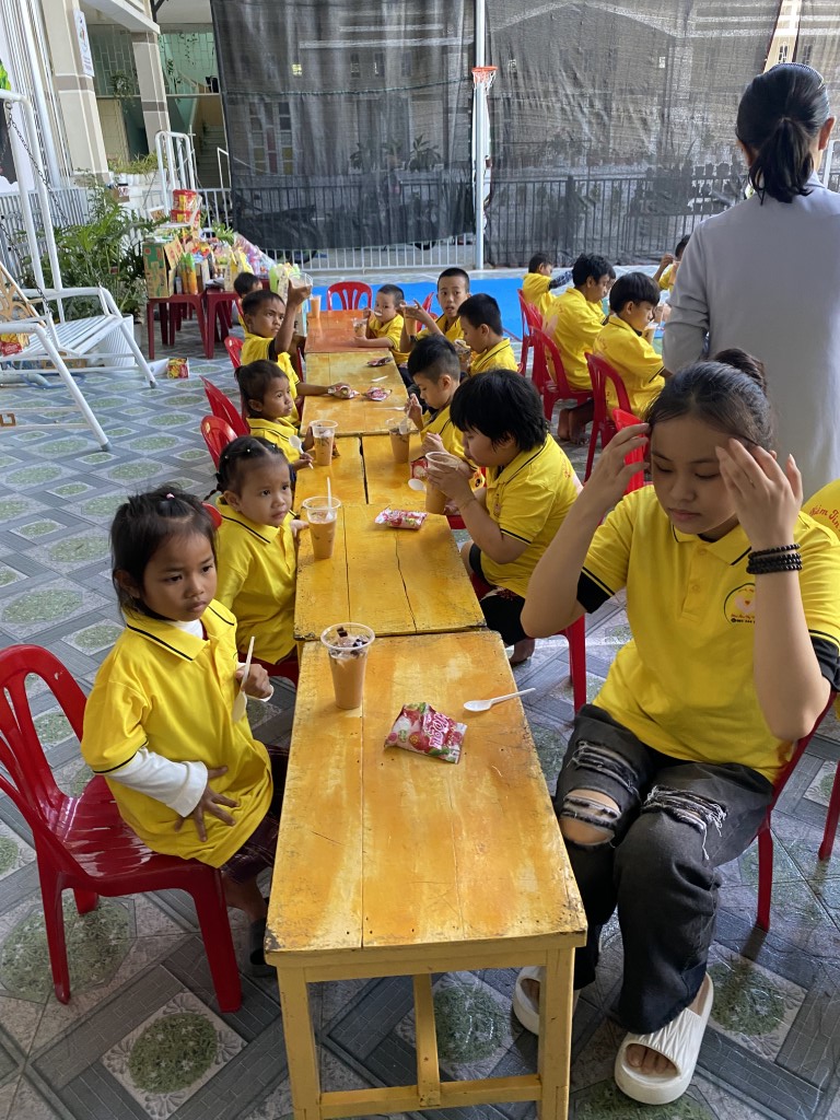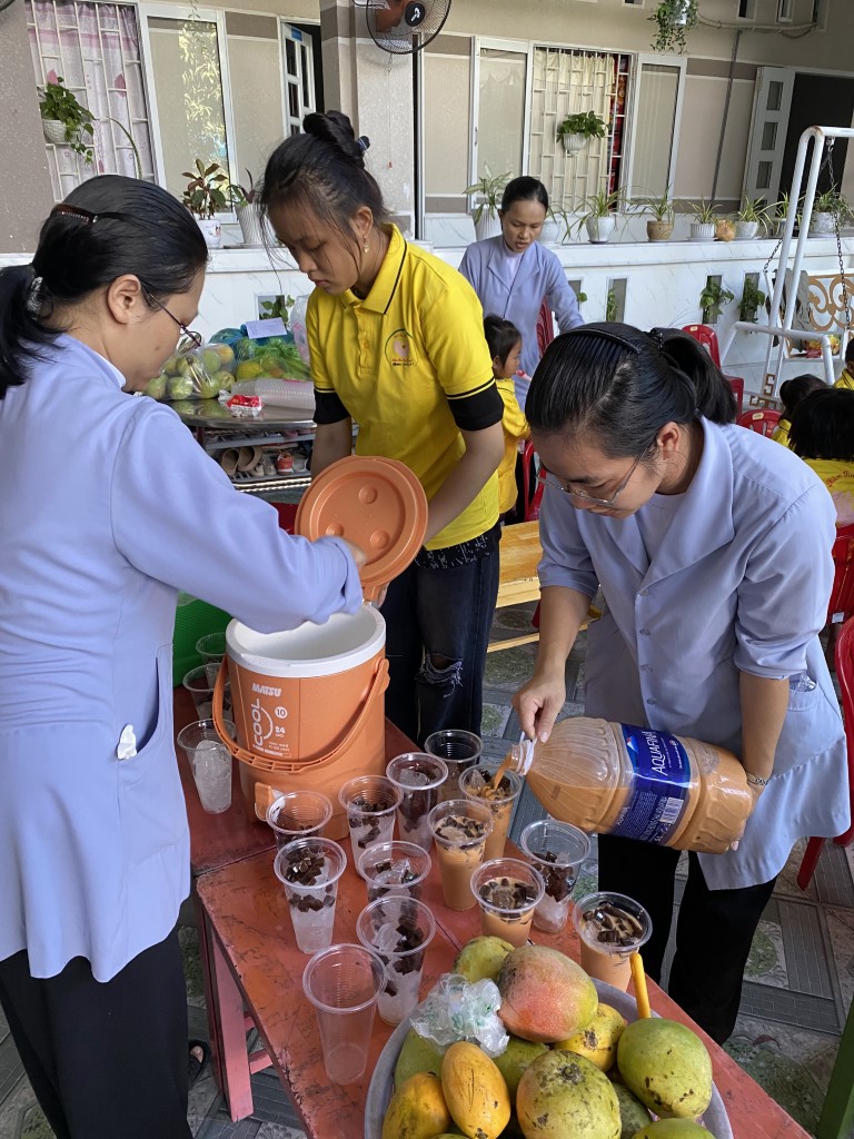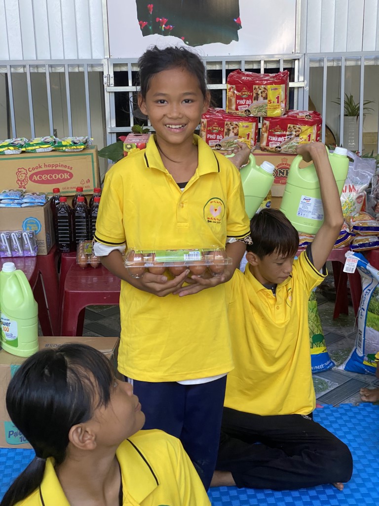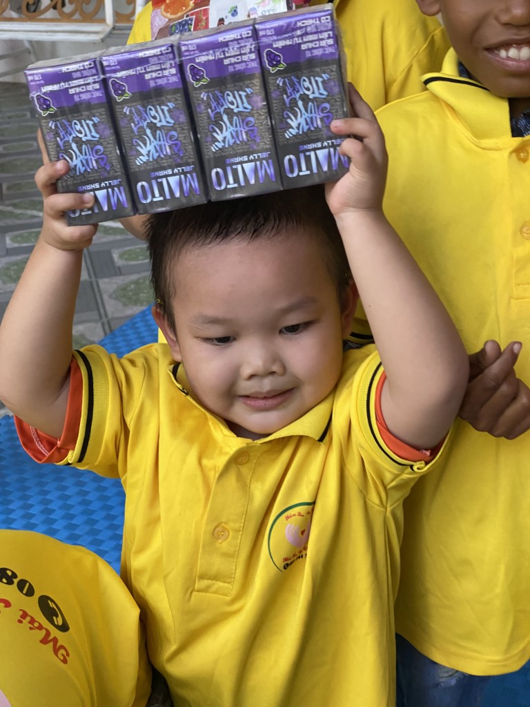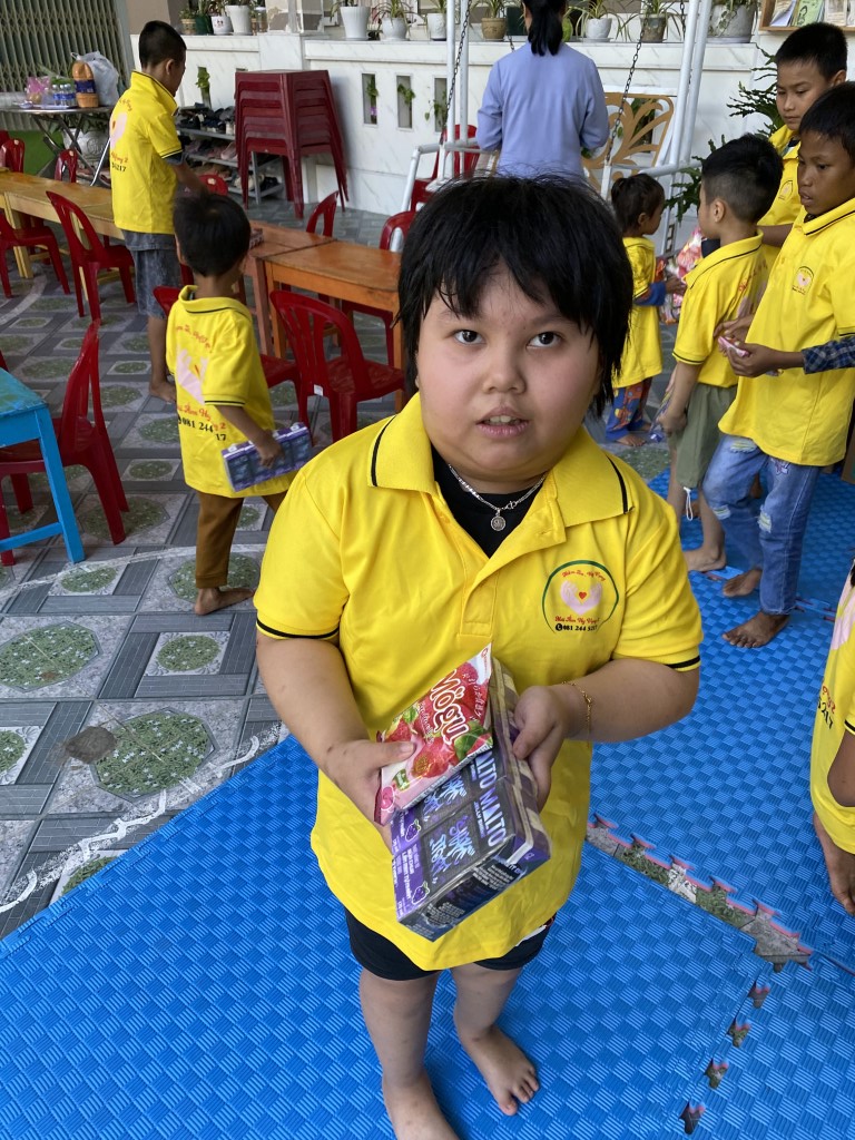 Upon arrival, we were warmly greeted by the children happily playing in the courtyard. Our team unloaded everything, including bags of rice, milk, noodles, fish sauce, sweet rice, eggs, lots of snacks, floor soap, dish soap, and insect spray. To add to the fun, we even prepared boba tea drinks for everyone. It was truly a wonderful day!
