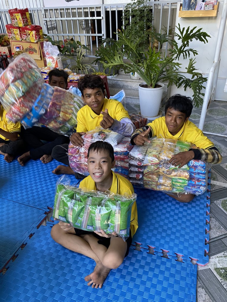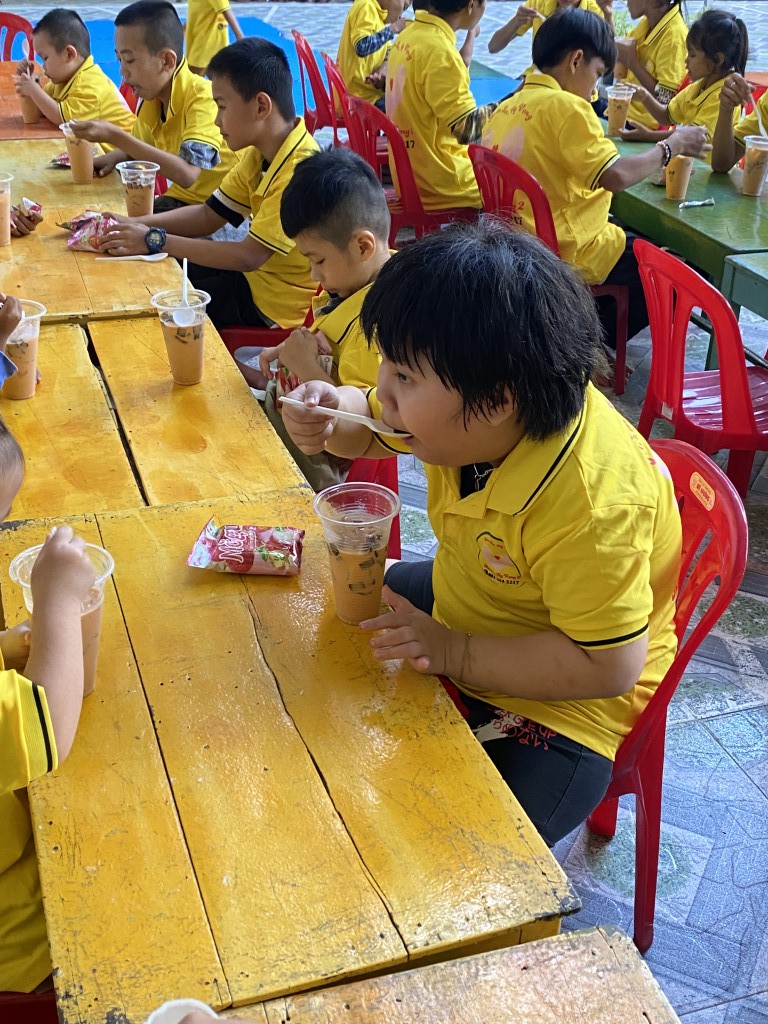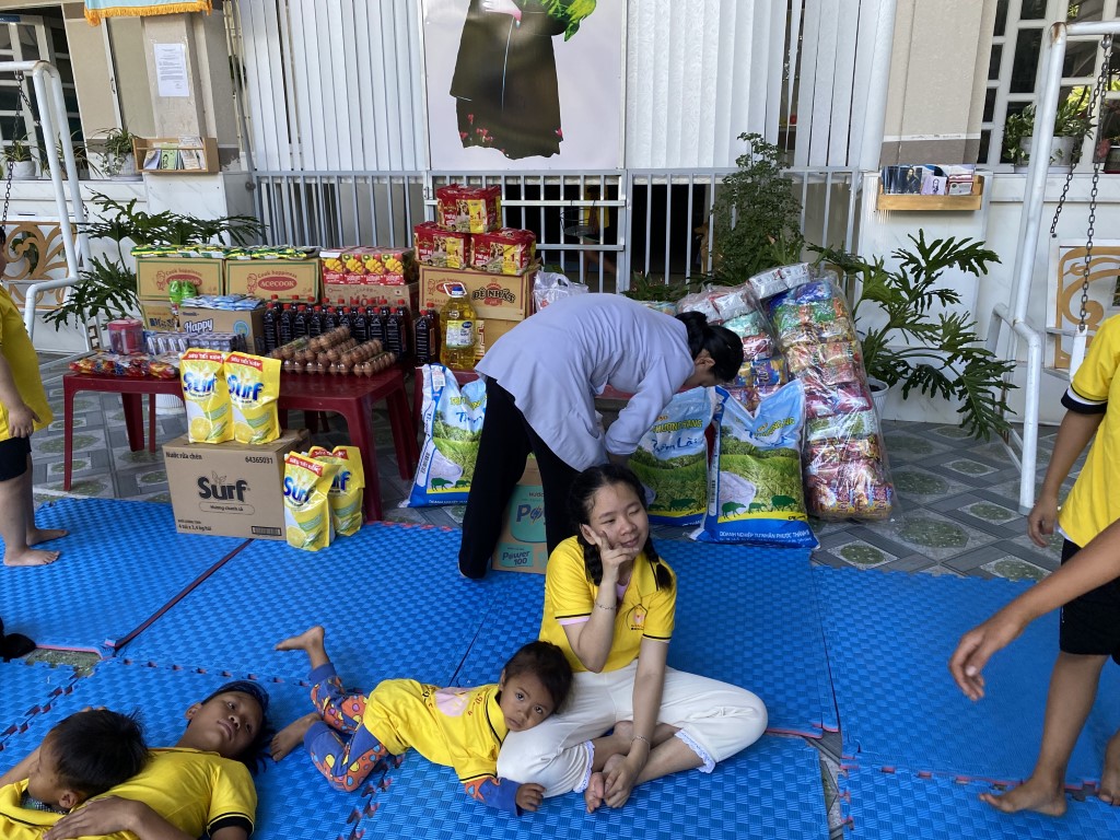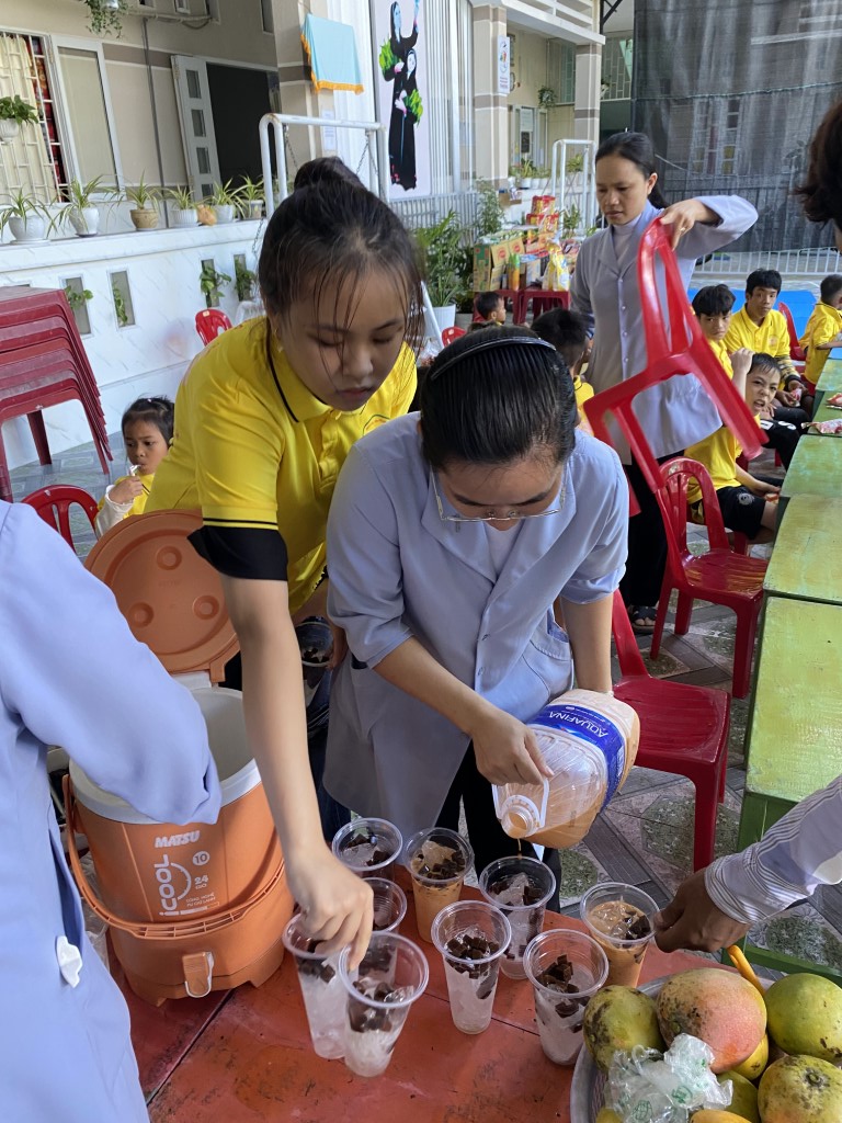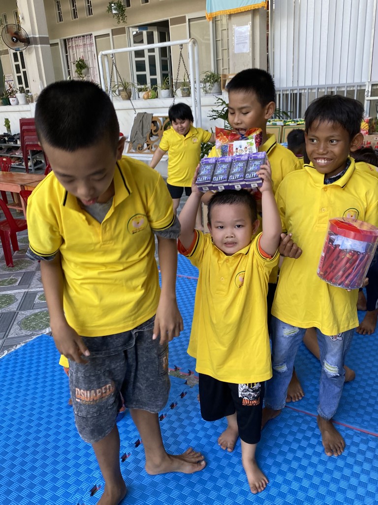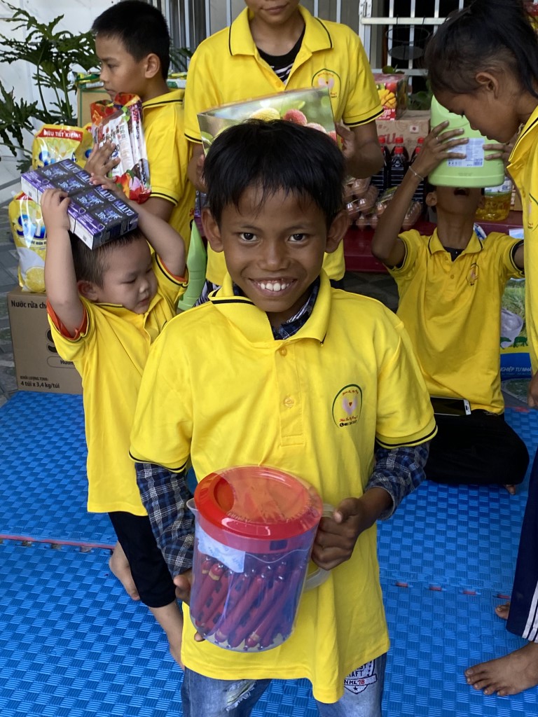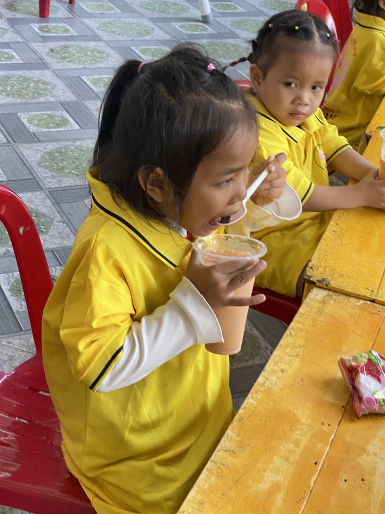 Upon arrival, we were warmly greeted by the children happily playing in the courtyard. Our team unloaded everything, including bags of rice, milk, noodles, fish sauce, sweet rice, eggs, lots of snacks, floor soap, dish soap, and insect spray. To add to the fun, we even prepared boba tea drinks for everyone. It was truly a wonderful day!