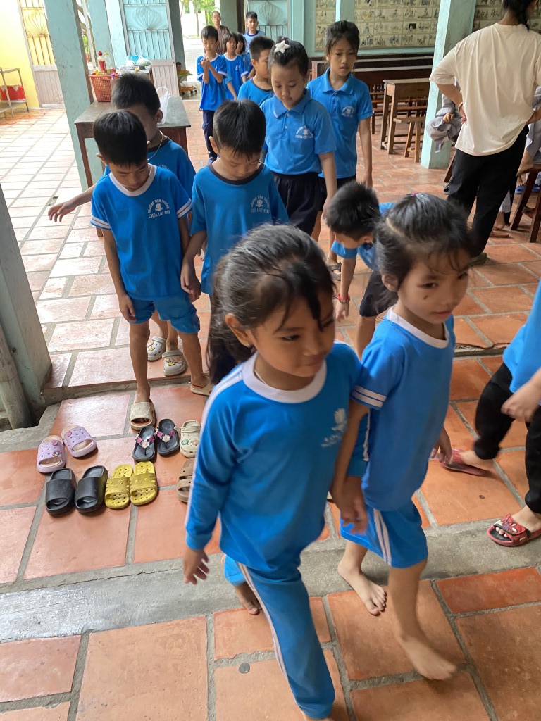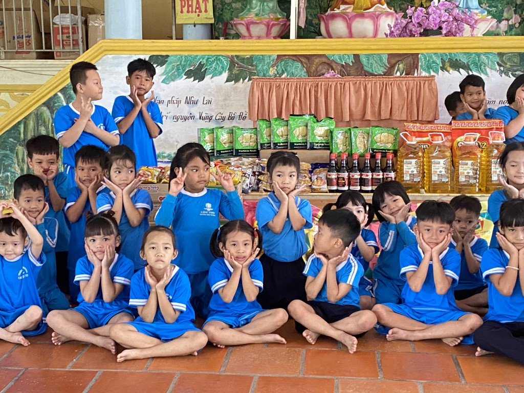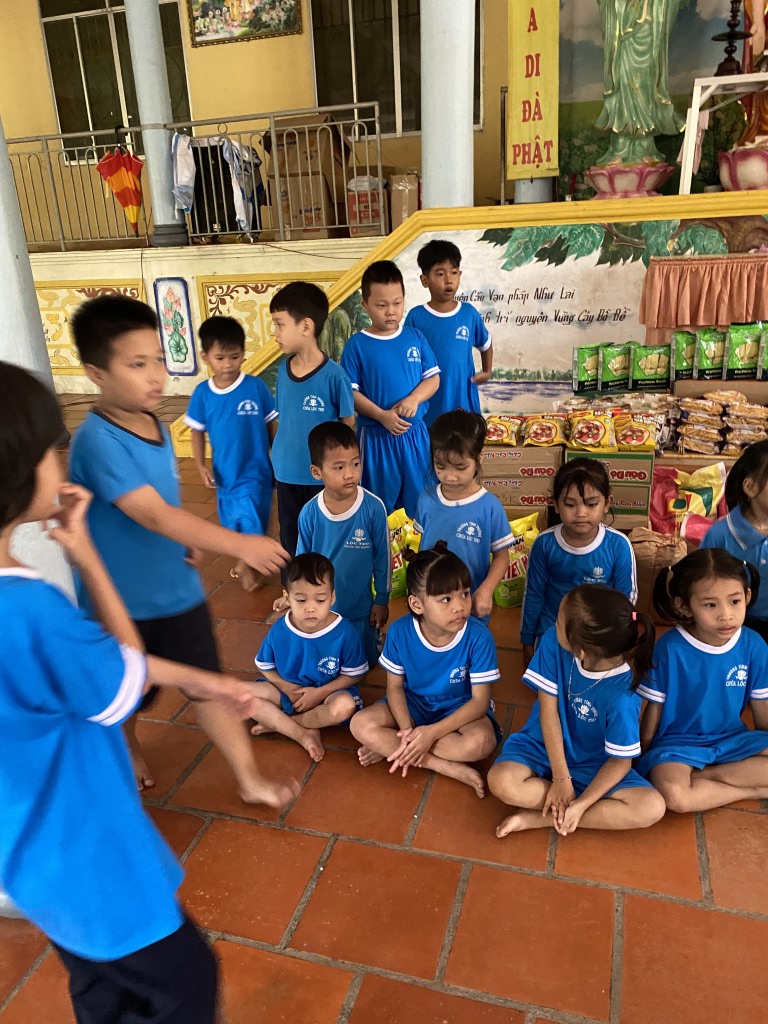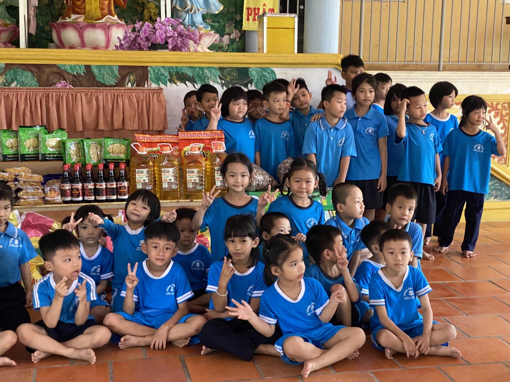 Upon our arrival, the children eagerly helped us unload and organize a month’s worth of staples. These included essential items like bags of rice, packages of noodles, meats, cooking oil, milk, shrimp noodles, boxes of ramen, seasonings, varieties of mushrooms, vegetarian fish sauce, potatoes, pumpkin, cleaning products, and toiletries.