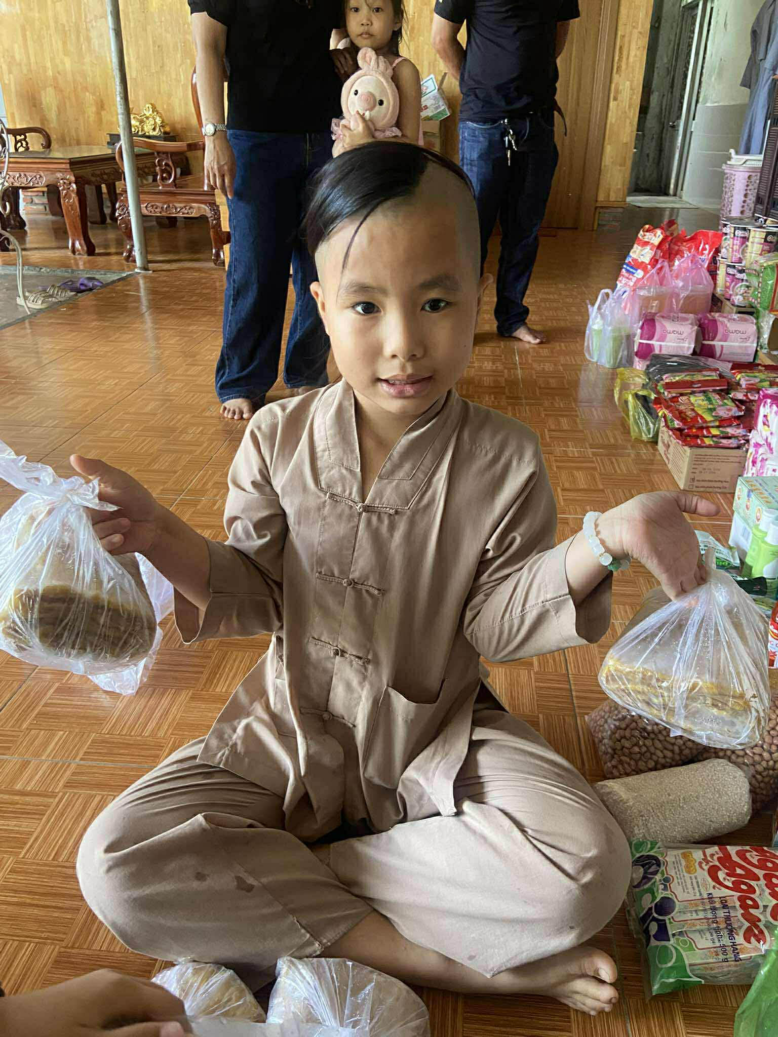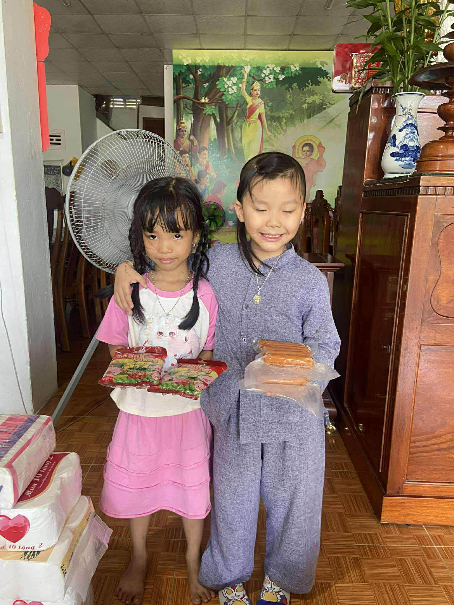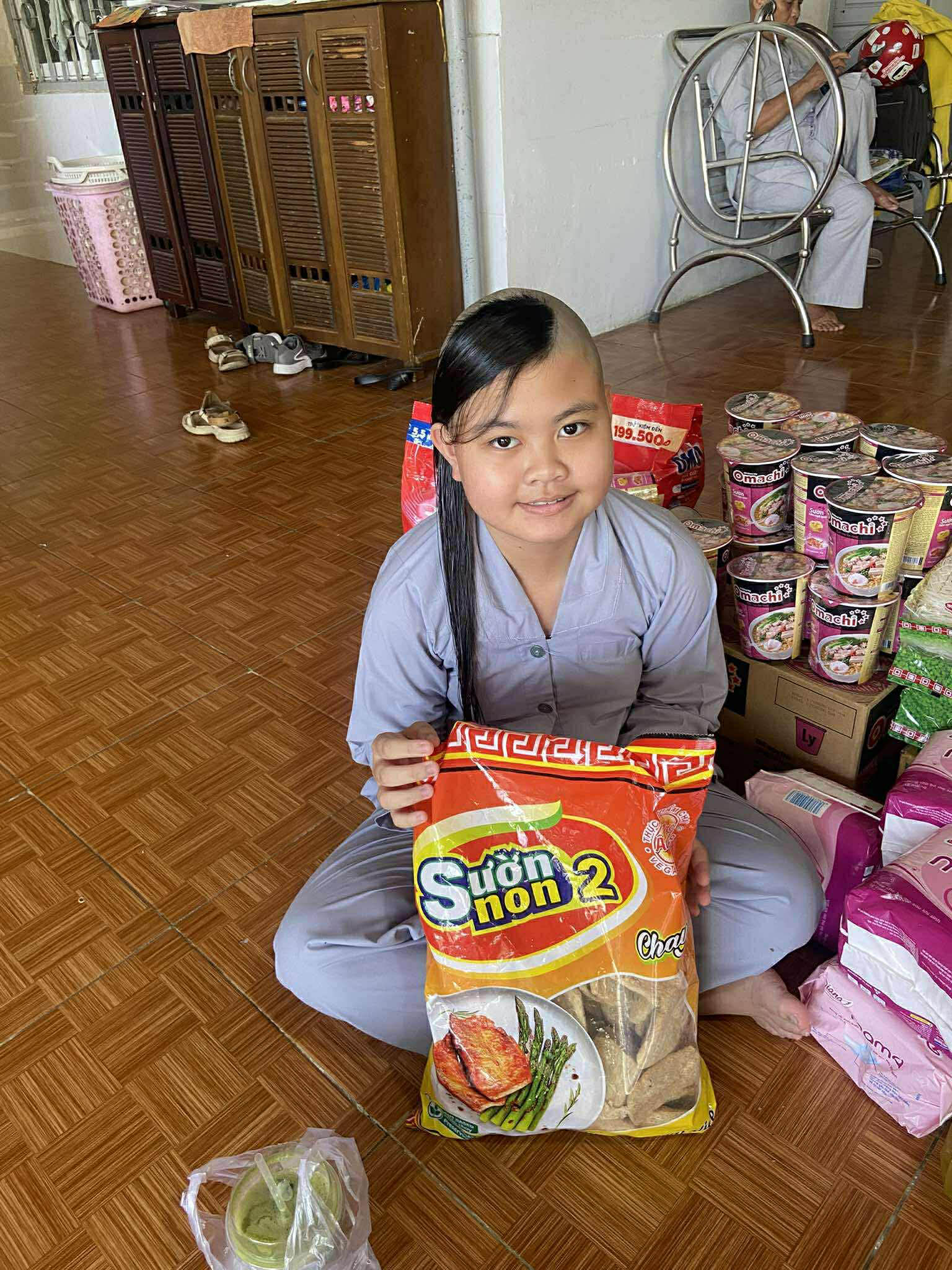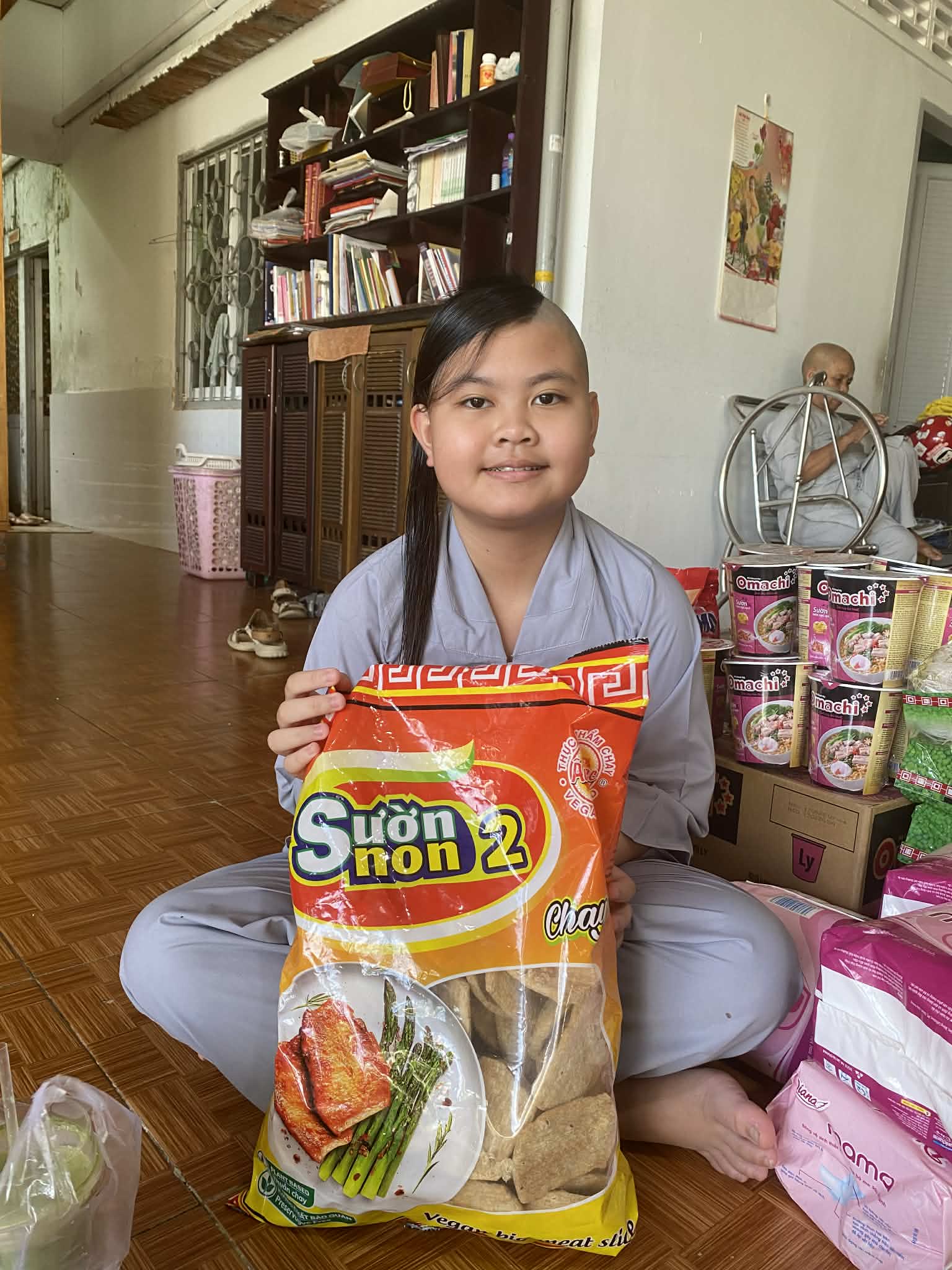 The delivery included a wide variety of necessities for the month: bamboo shoots, pork rolls, sausages, beef soup, chili sauce, fish sauce, soy sauce, seaweed, vegetable oil, rice noodles, bags of rice, peanuts, sugar, bottled water, quail eggs, mouthwash, socks, shampoo, cleaning supplies, toiletries, and dishwashing liquid.