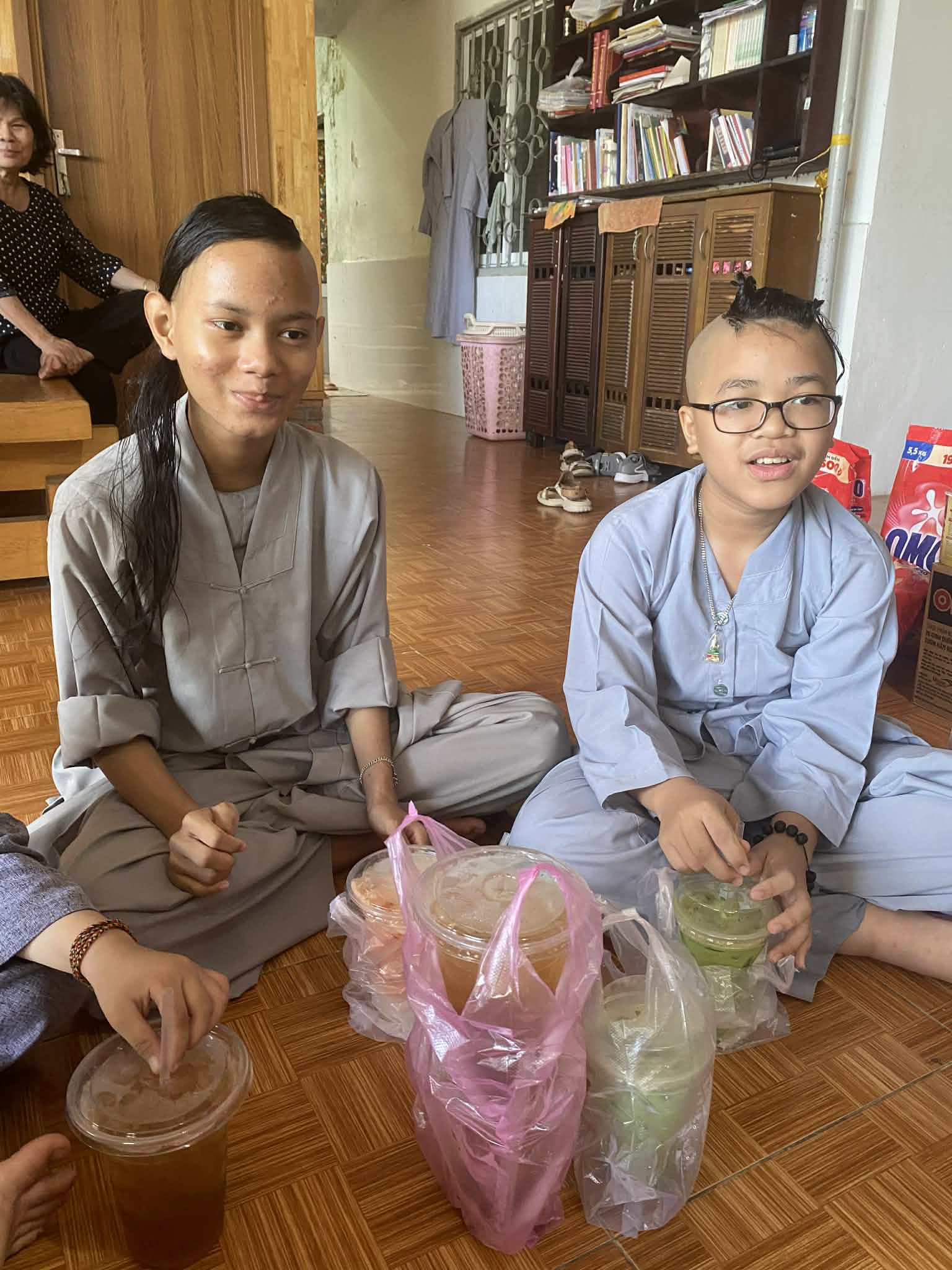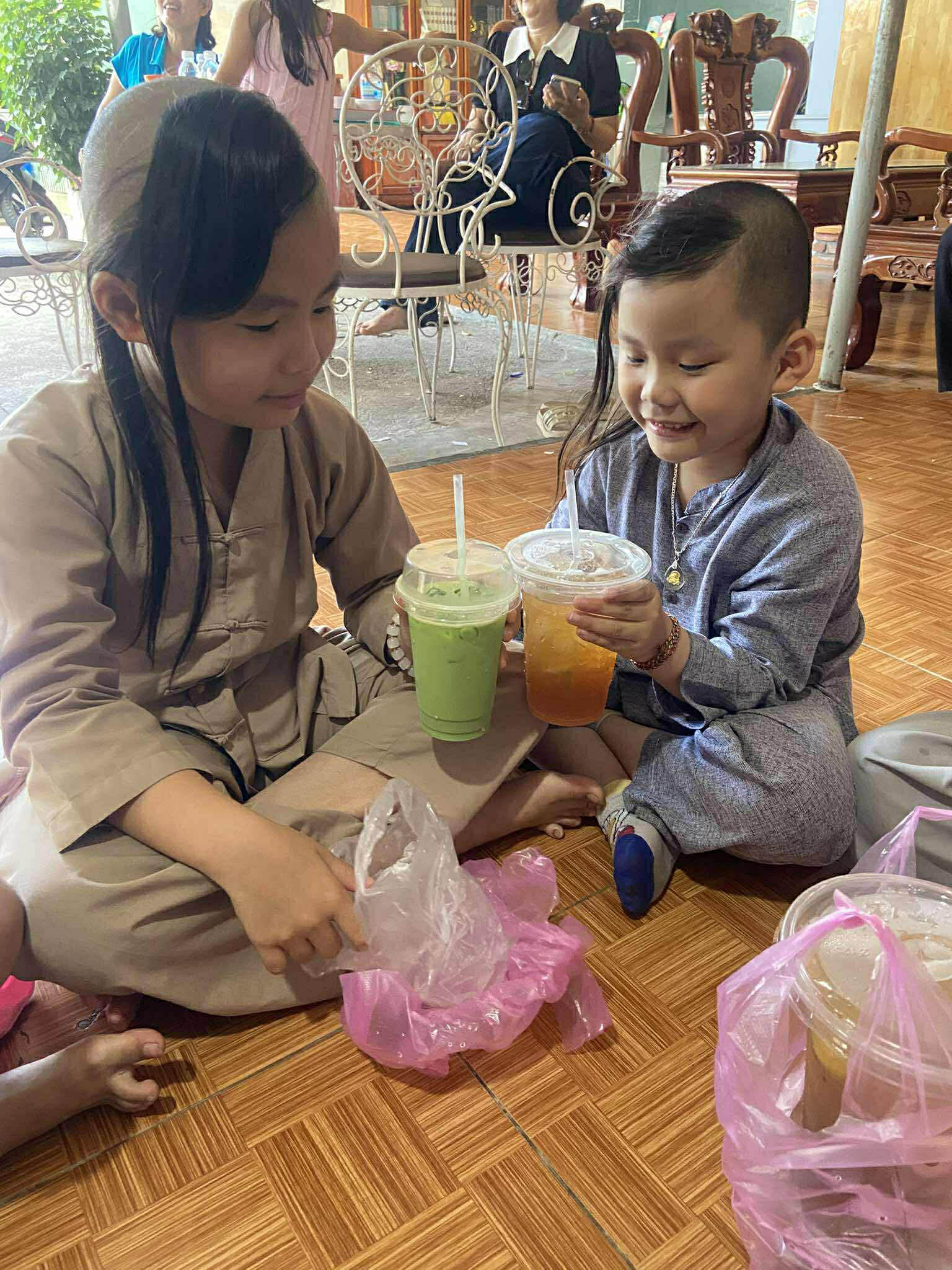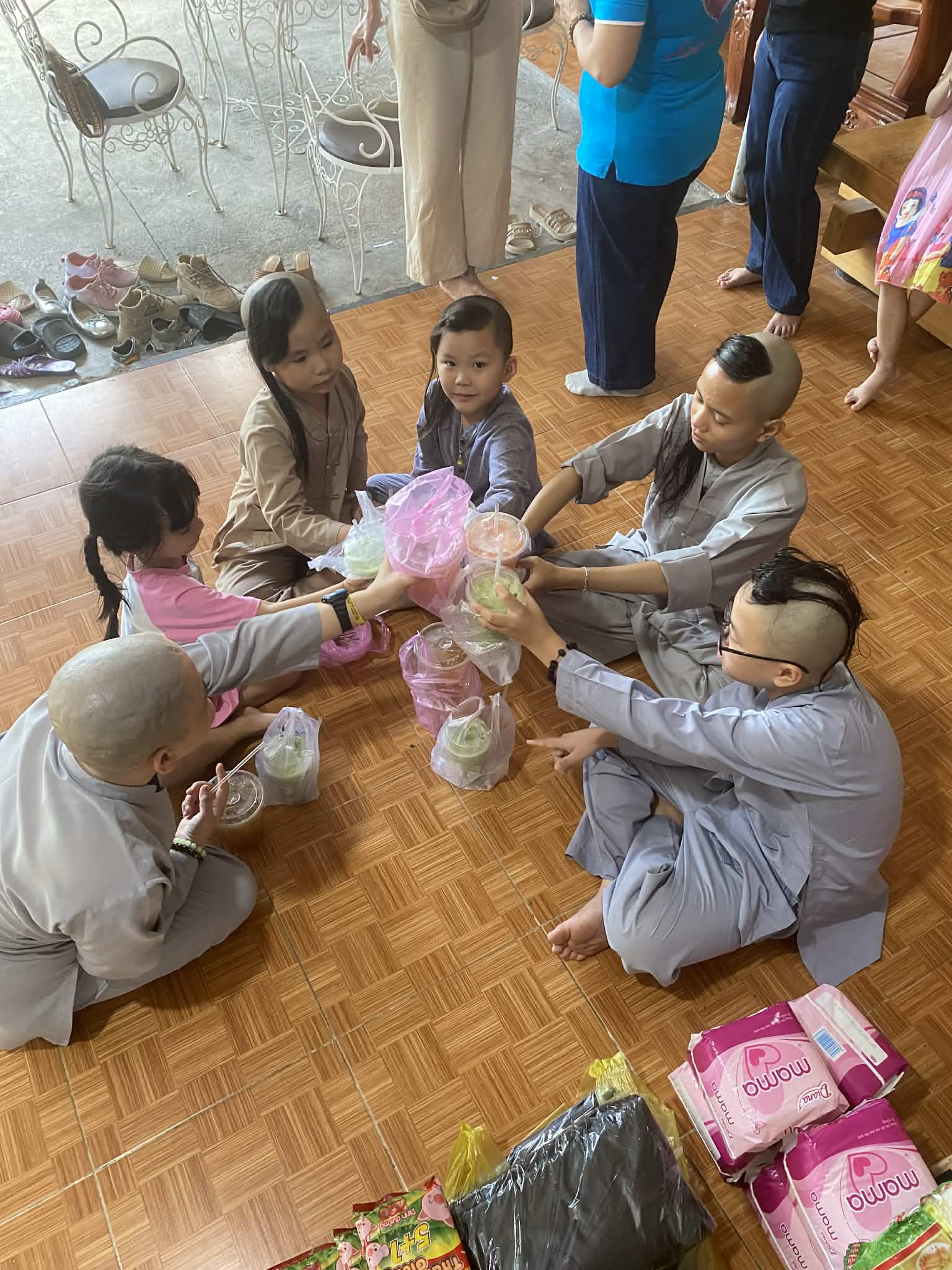To make the visit extra fun, our volunteers brought boba tea drinks for all the children! Everyone sat in a circle on the floor, happily enjoying their treat—a great moment of simple joy.