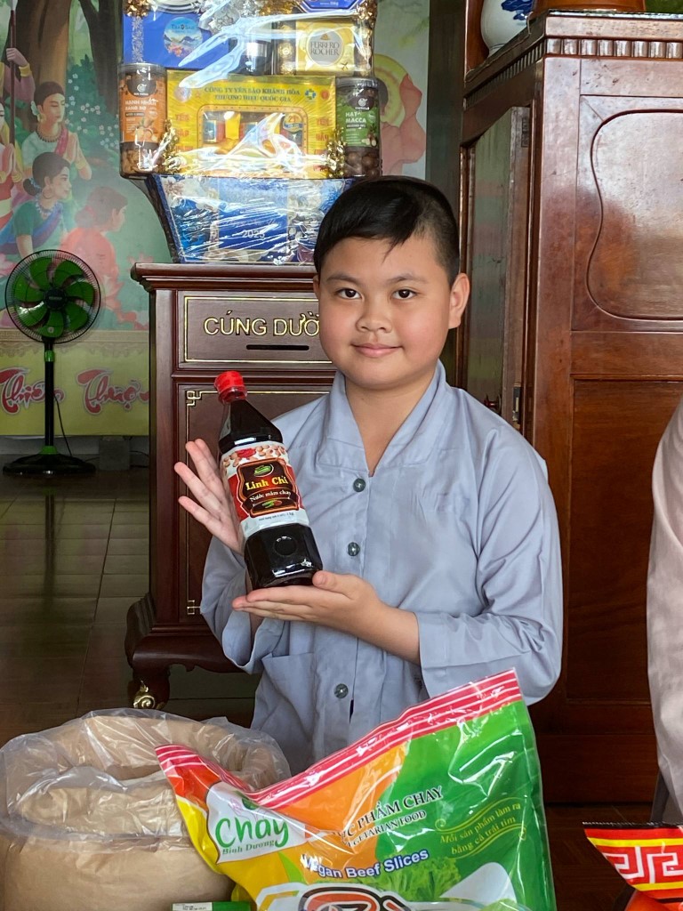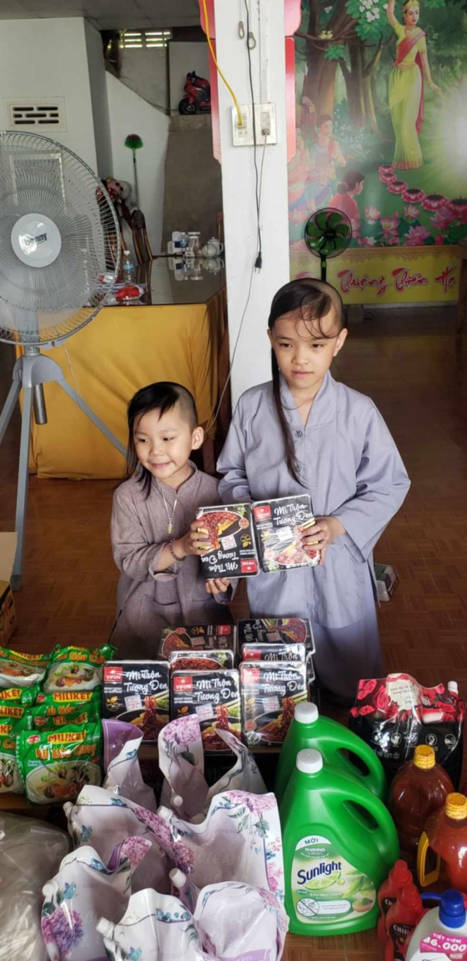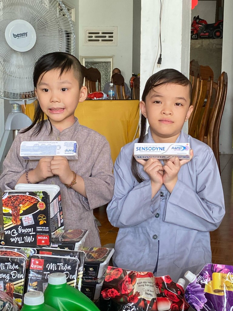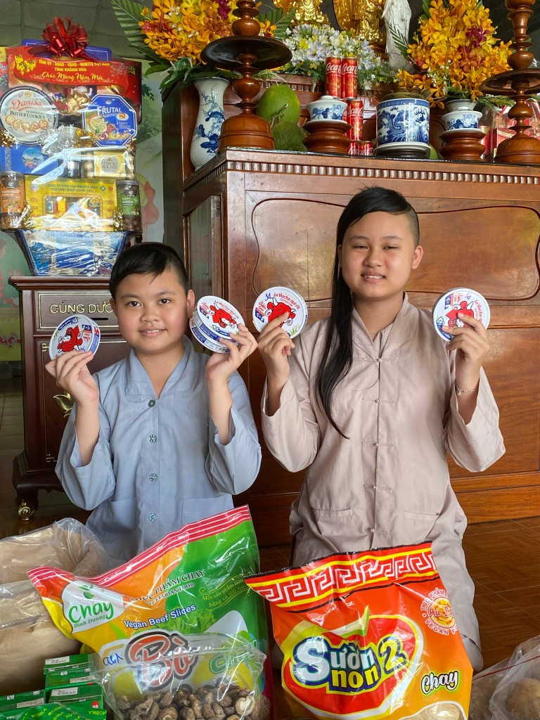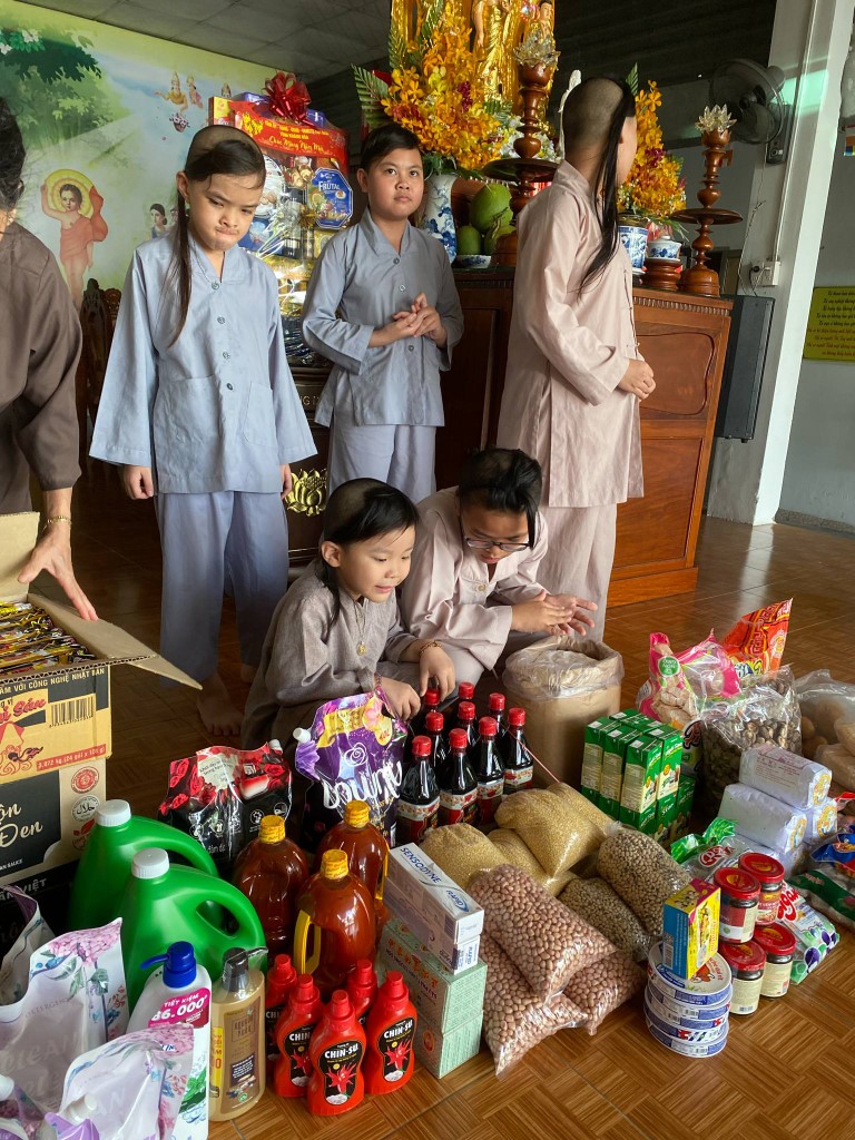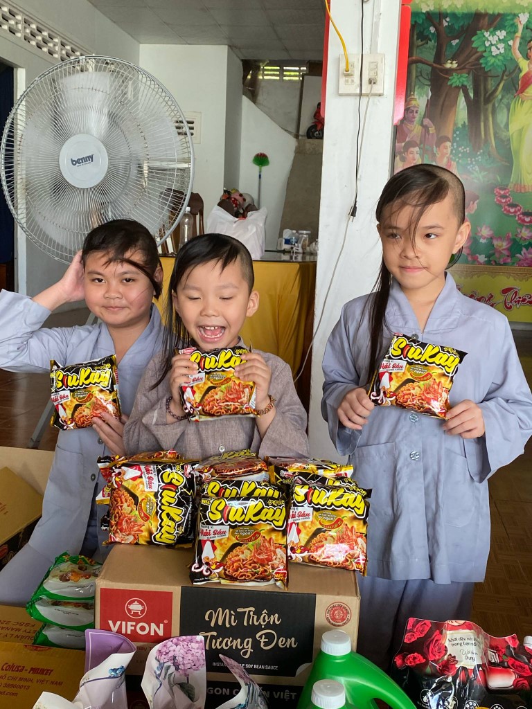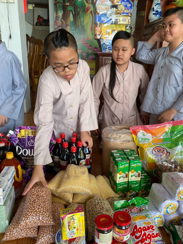 This month, we brought fresh vegetables, packages of noodles, varieties of beans, milk, tapioca flour, chili sauce, vanilla, jello, cheese, fish sauce, sugar, tofu sheets, mushrooms, varieties of vegan meats including pork, beef, sausages, and chicken, fabric softener, dish soap, tiger balm, toothpaste, shampoo, trash cans, and laundry detergent.