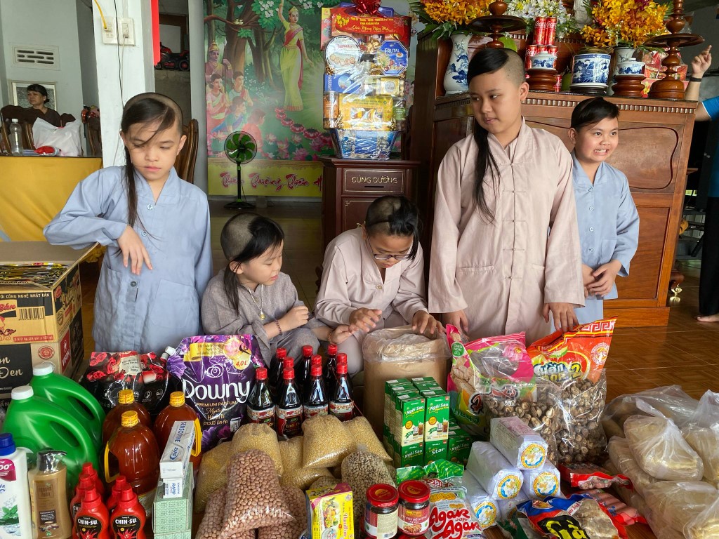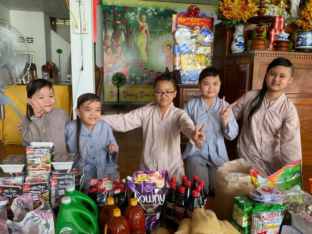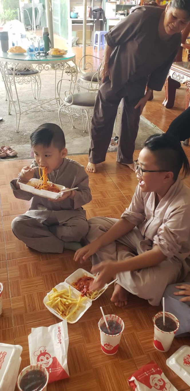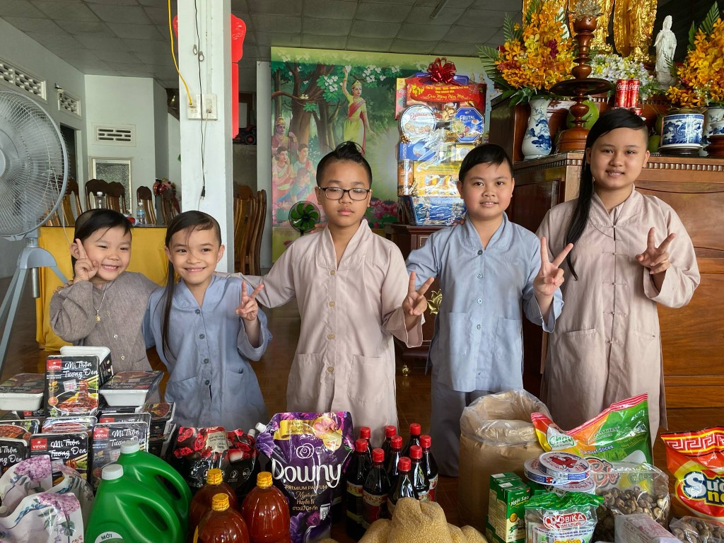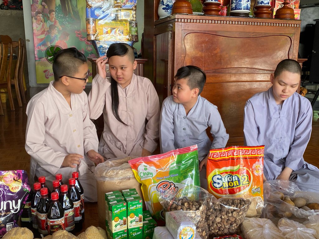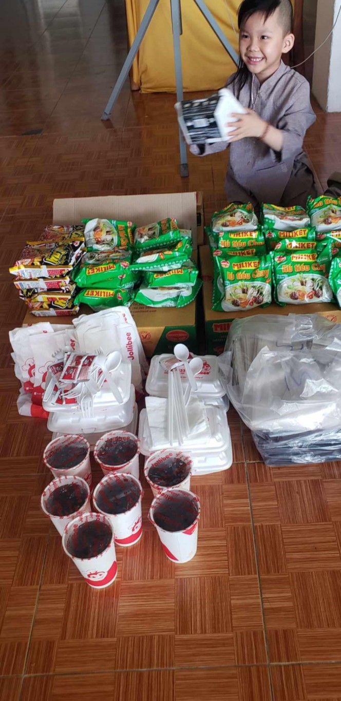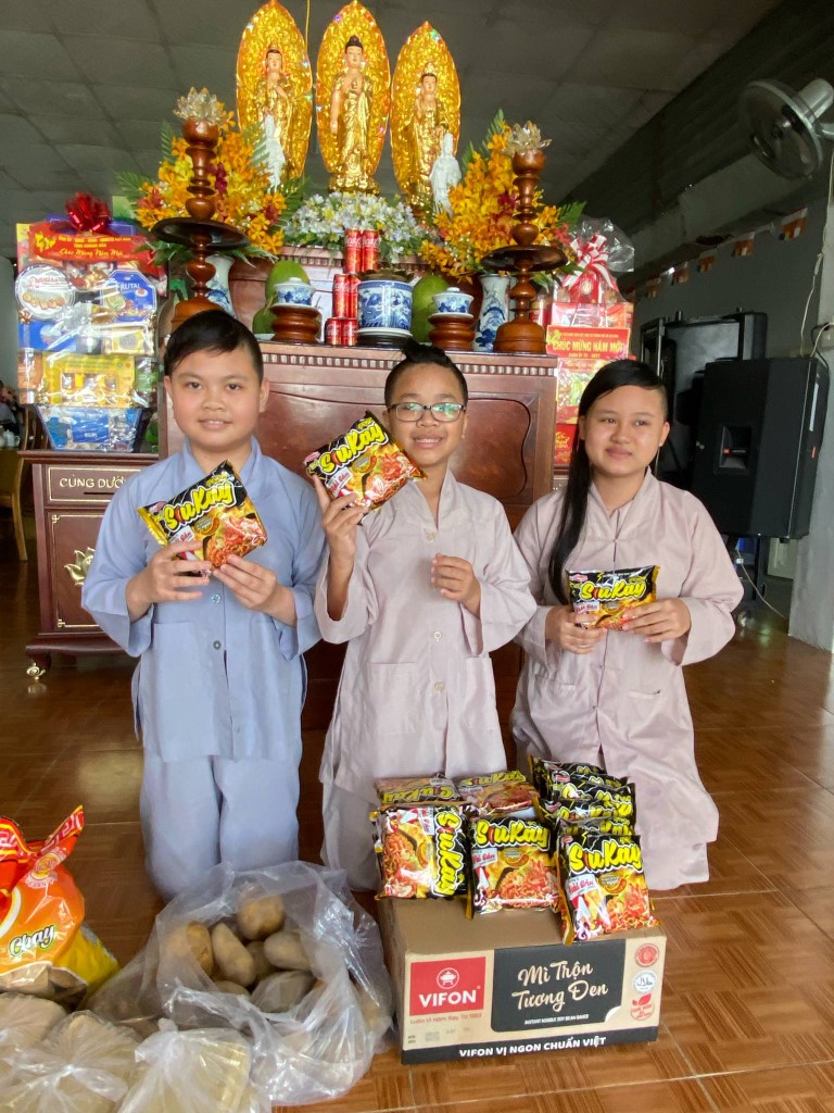 This month, we brought fresh vegetables, packages of noodles, varieties of beans, milk, tapioca flour, chili sauce, vanilla, jello, cheese, fish sauce, sugar, tofu sheets, mushrooms, varieties of vegan meats including pork, beef, sausages, and chicken, fabric softener, dish soap, tiger balm, toothpaste, shampoo, trash cans, and laundry detergent.