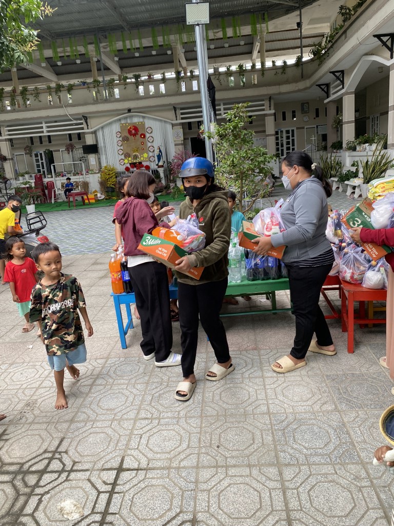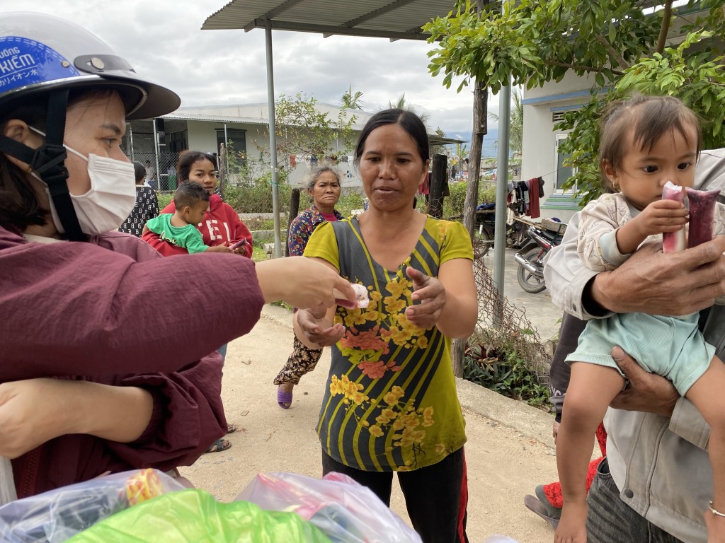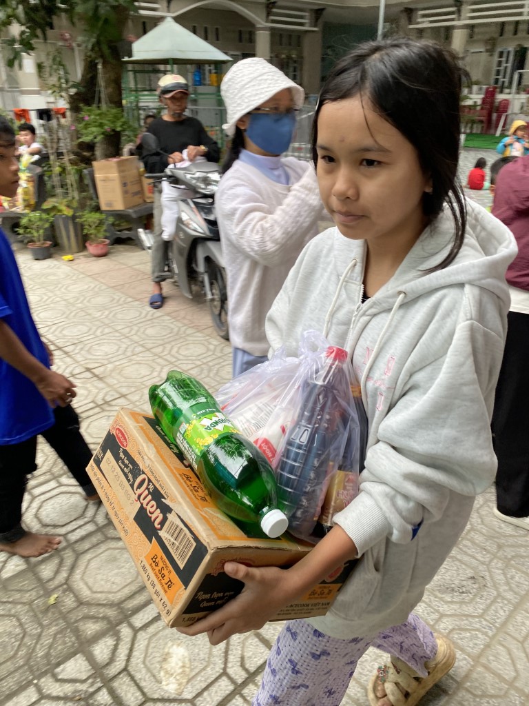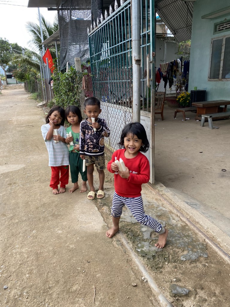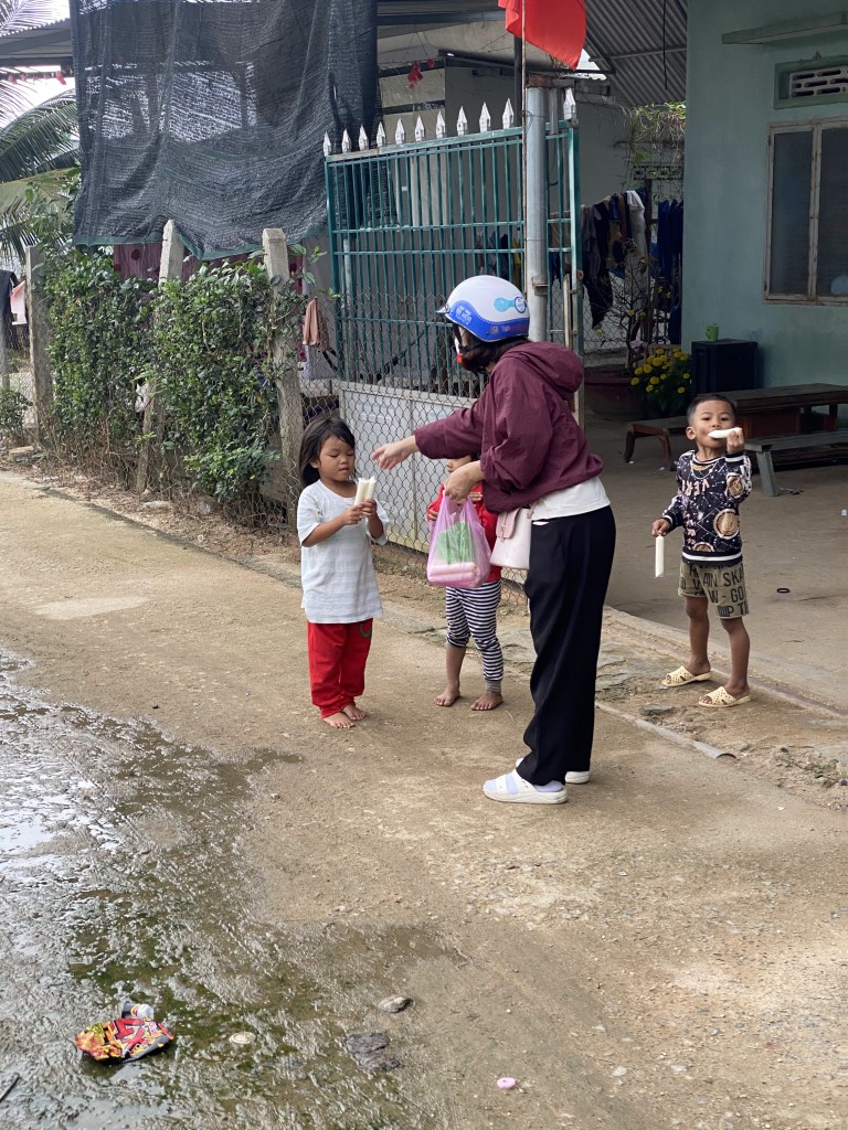 This year, they arranged to have 85 care packages given to families in Cam Lam, a rural community to the south of Nha Trang. Each care package included a bag of rice, a box of noodles, seasonings, soy sauce, fish sauce, yogurt, sugar, soda, and Tet sweets. They also brought lots of popsicles to hand out to children in the neighborhood.