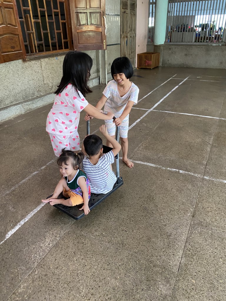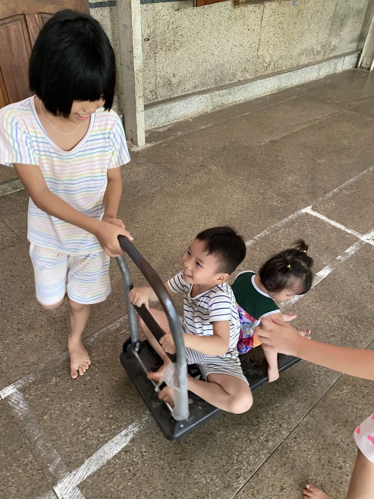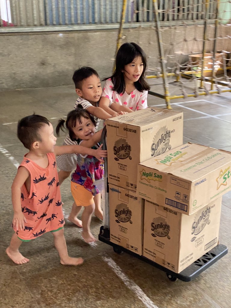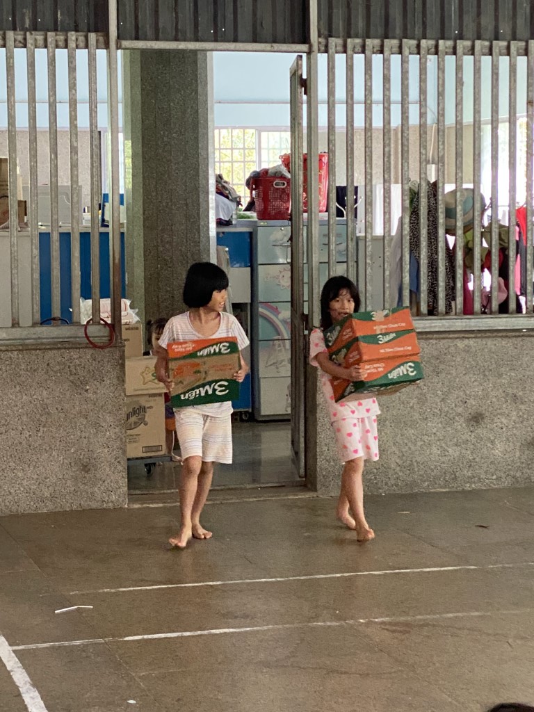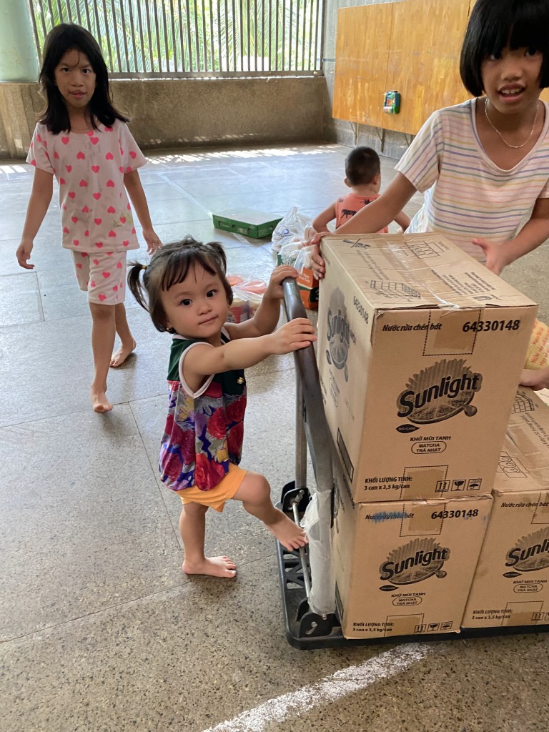 Coordinating closely with the dedicated caretakers, our volunteer team sourced a fresh supply of essential items from local markets. We loaded up the van and were thrilled to be greeted by the children, who were excellent helpers—carrying everything into the common room. Even the rolling cart became a source of cute playtime!