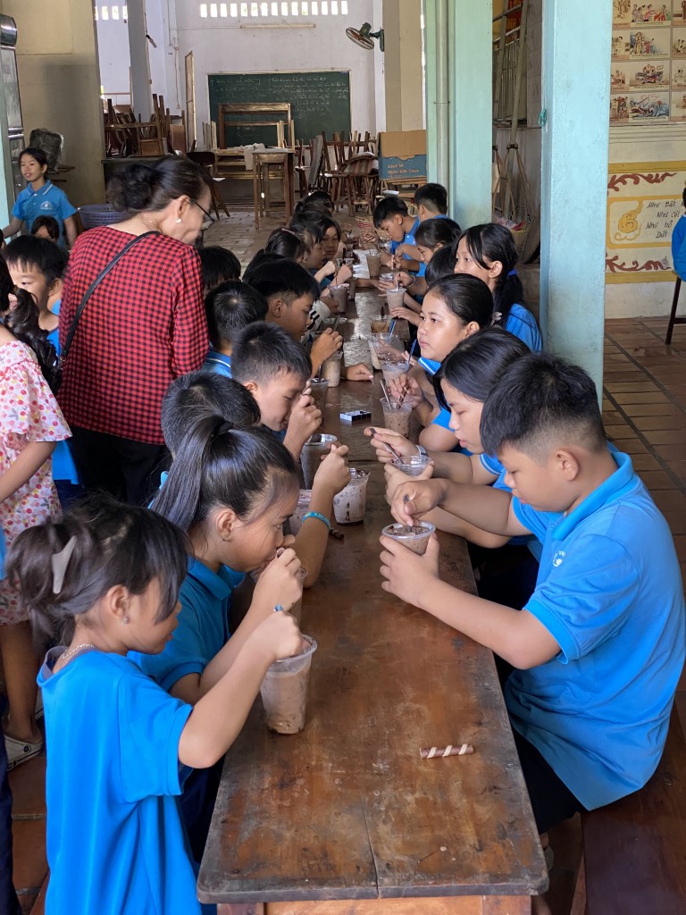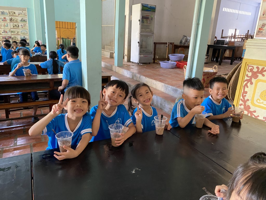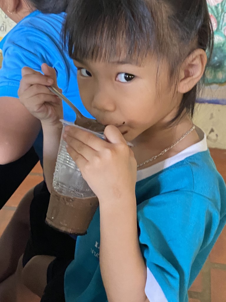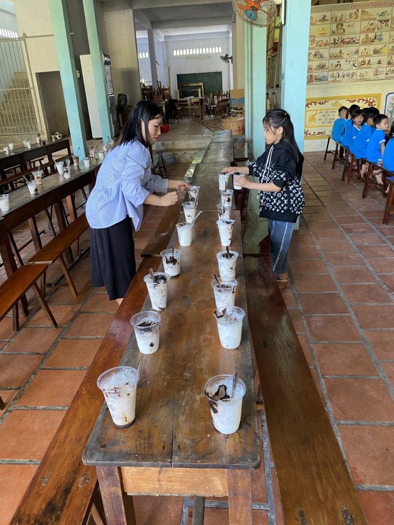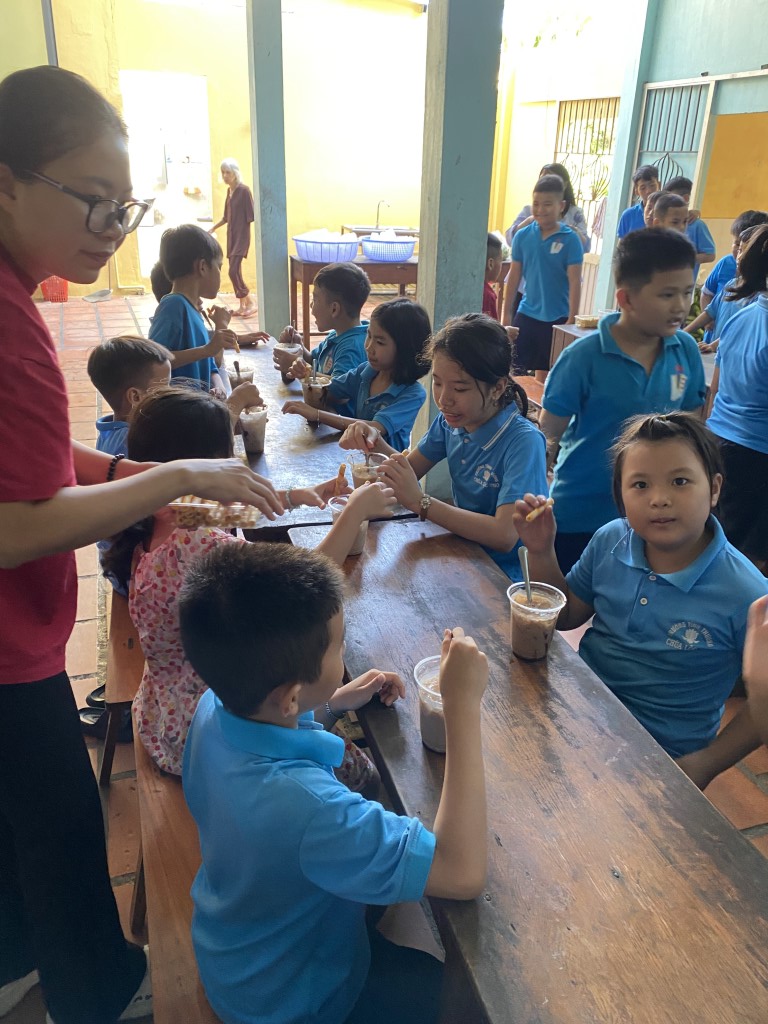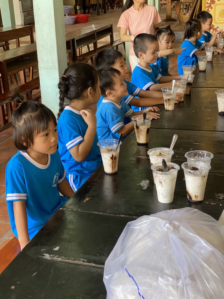 After stacking the provisions in the courtyard, the children took a break from their studies to come out and greet our team. As a fun surprise, our team prepared a sweet iced coffee-flavored treat for all the little ones. So fun!