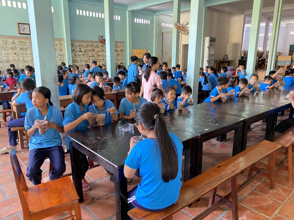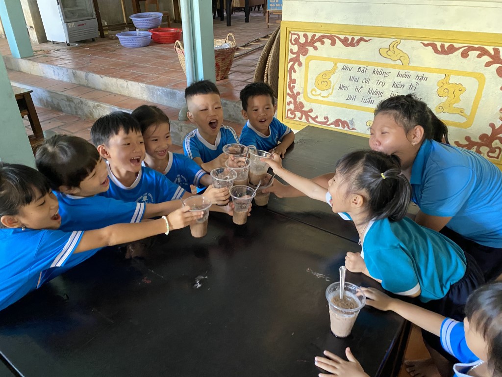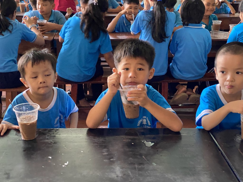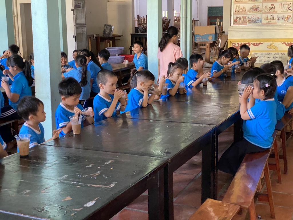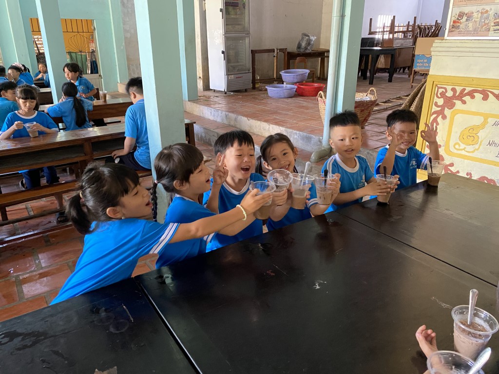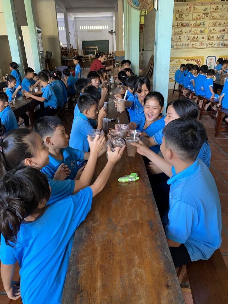 After stacking the provisions in the courtyard, the children took a break from their studies to come out and greet our team. As a fun surprise, our team prepared a sweet iced coffee-flavored treat for all the little ones. So fun!